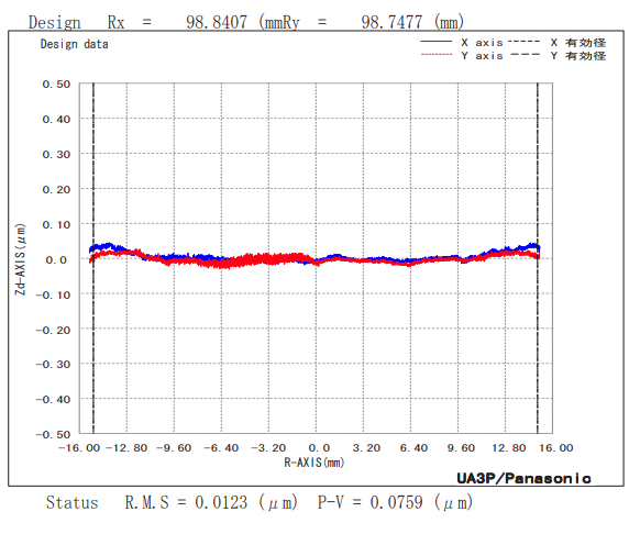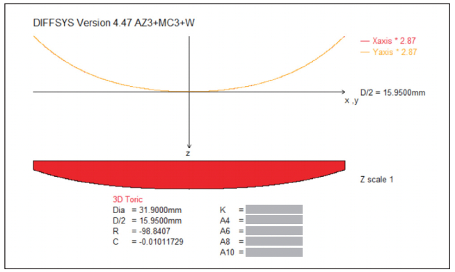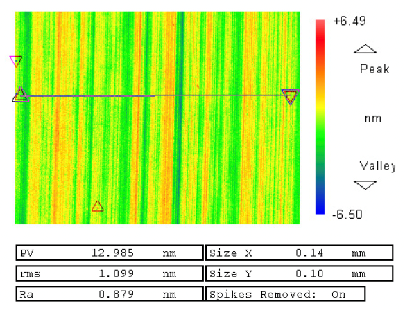 Goal: Demonstrate freeform surface finish and form accuracy by diamond turning an aspheric toric on the Freeform® L Ultra Precision Machine platform using Adaptive Control Technology (ACT). Process: XZC diamond turning with Y axis active conducted at customer facility. Part Details: • Material: Nickel Phosphorus plated steel Part photo Process Details: • Tool: Single point diamond tool • Tool radius: 0.3 mm • Work speed: 1200 RPM • Feed rate: 1.2 mm/min • Finish pass: 16 min • Coolant: Odorless mineral spirits (OMS) Results: • Form accuracy: 76 nm PV (12 nm RMS) • Surface finish: 0.88 nm Ra Profile measurements along 2 primary medians White light interferometer measurement