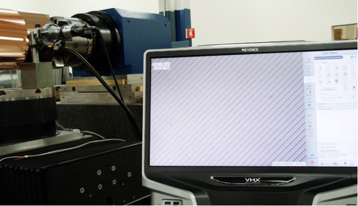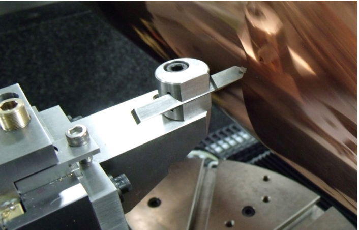 XZC diamond turning on a DRL1600 with a 90º included angle tool mounted at a 45º angle. Tight temperature control is used over the long cutting time to insure that there is no visible seam between the first and last groove.