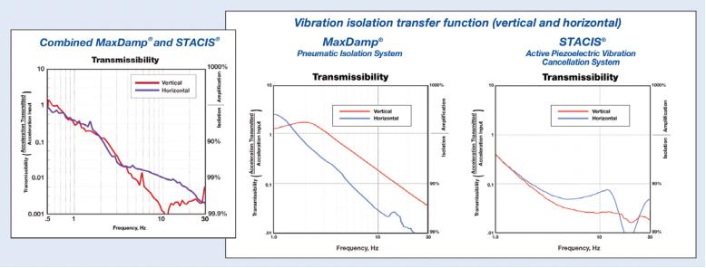 The combined performance of the MaxDamp isolators supported by a STACIS platform system results in performance that is the sum of the two vibration isolation transfer functions. That is, the vibration isolation of the two systems is additive.