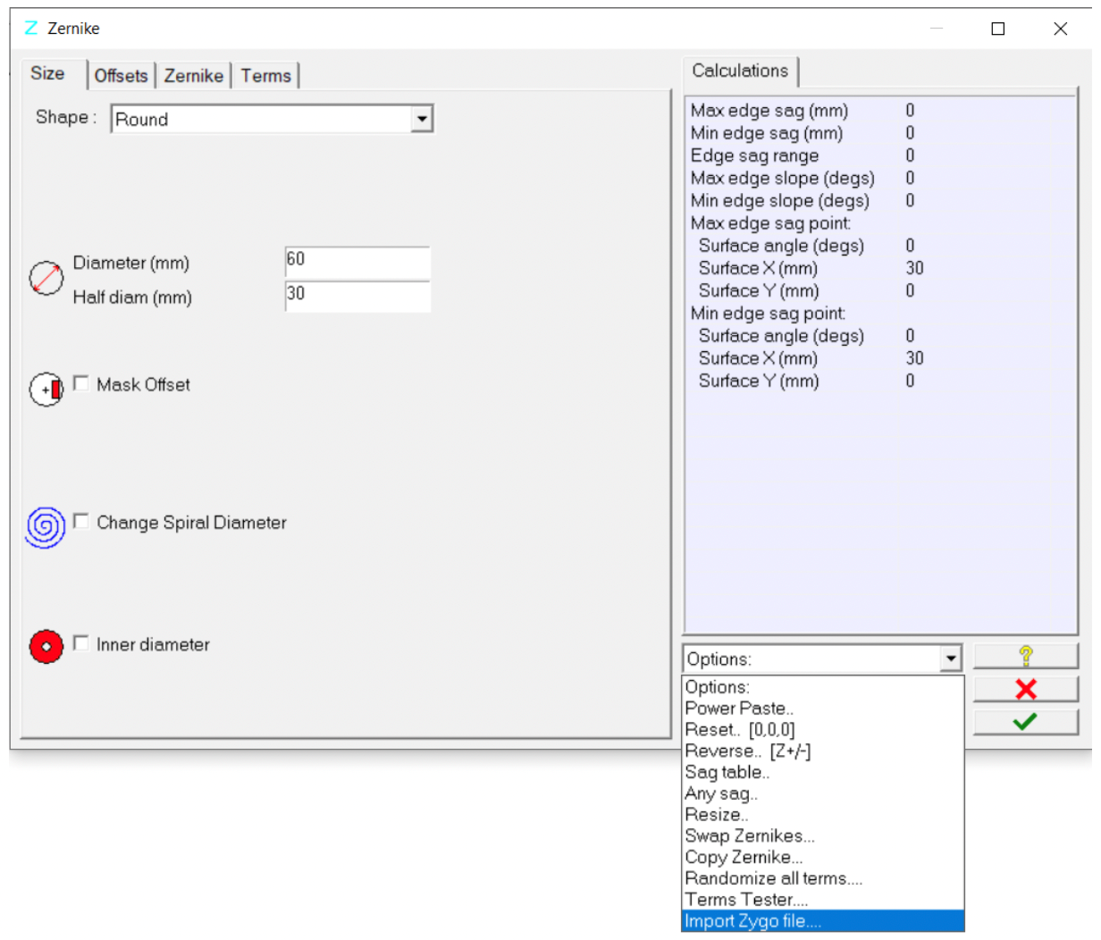 Zygo(.int) files can be imported as part of measurement corrections file that has the values in form of Zernike terms. This file is imported by chosing “Import Zygo file....” from the Options drop-down menu.