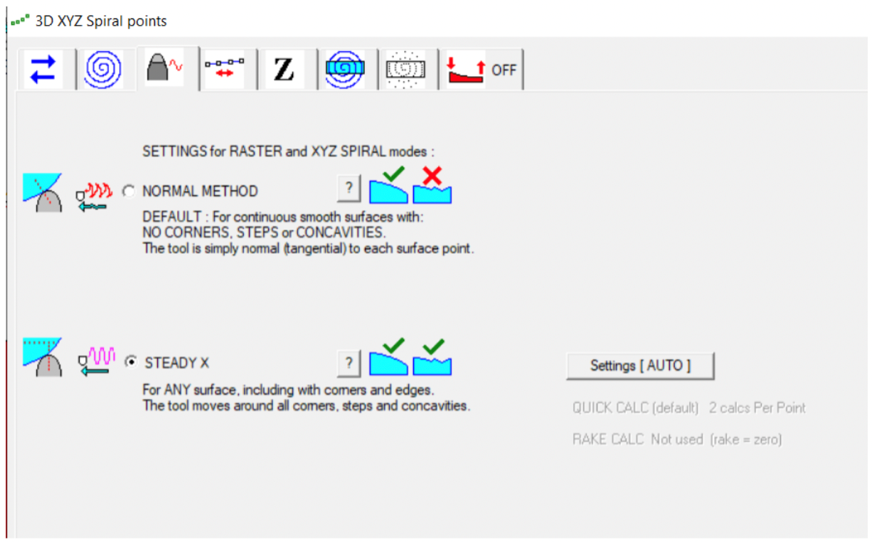 STEADY X tool path is now supported for XYZ spiral Pattern for diamond tool turning. For Raster CXZ and Spiral XYZ toolpaths, all associated settings, rake calcs, measurement corrections, graphics etc have been altered accordingly