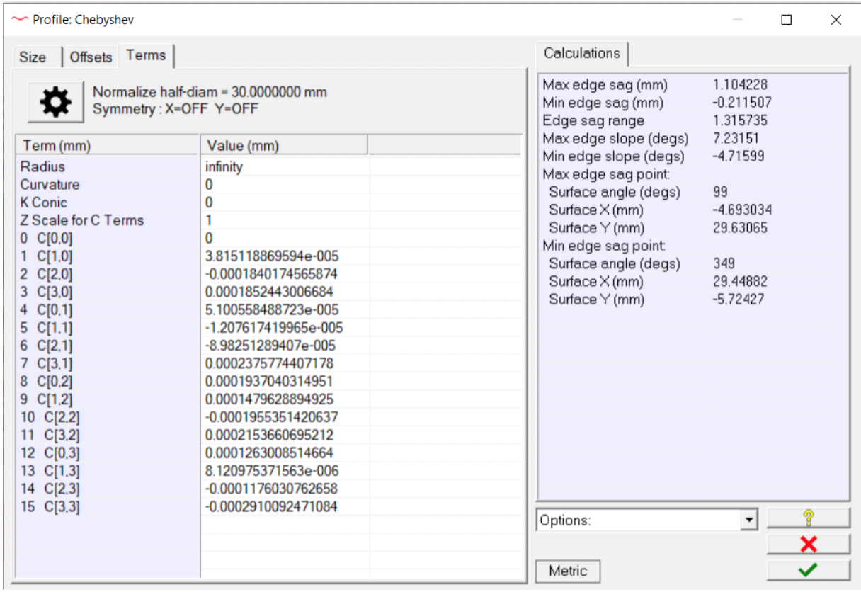 The sag equation in DIFFSYS, z = fn(x,y) is similar to the one in the ZEMAX optical design program. It consists of a sum of Chebyshev terms added to a standard asphere equation.