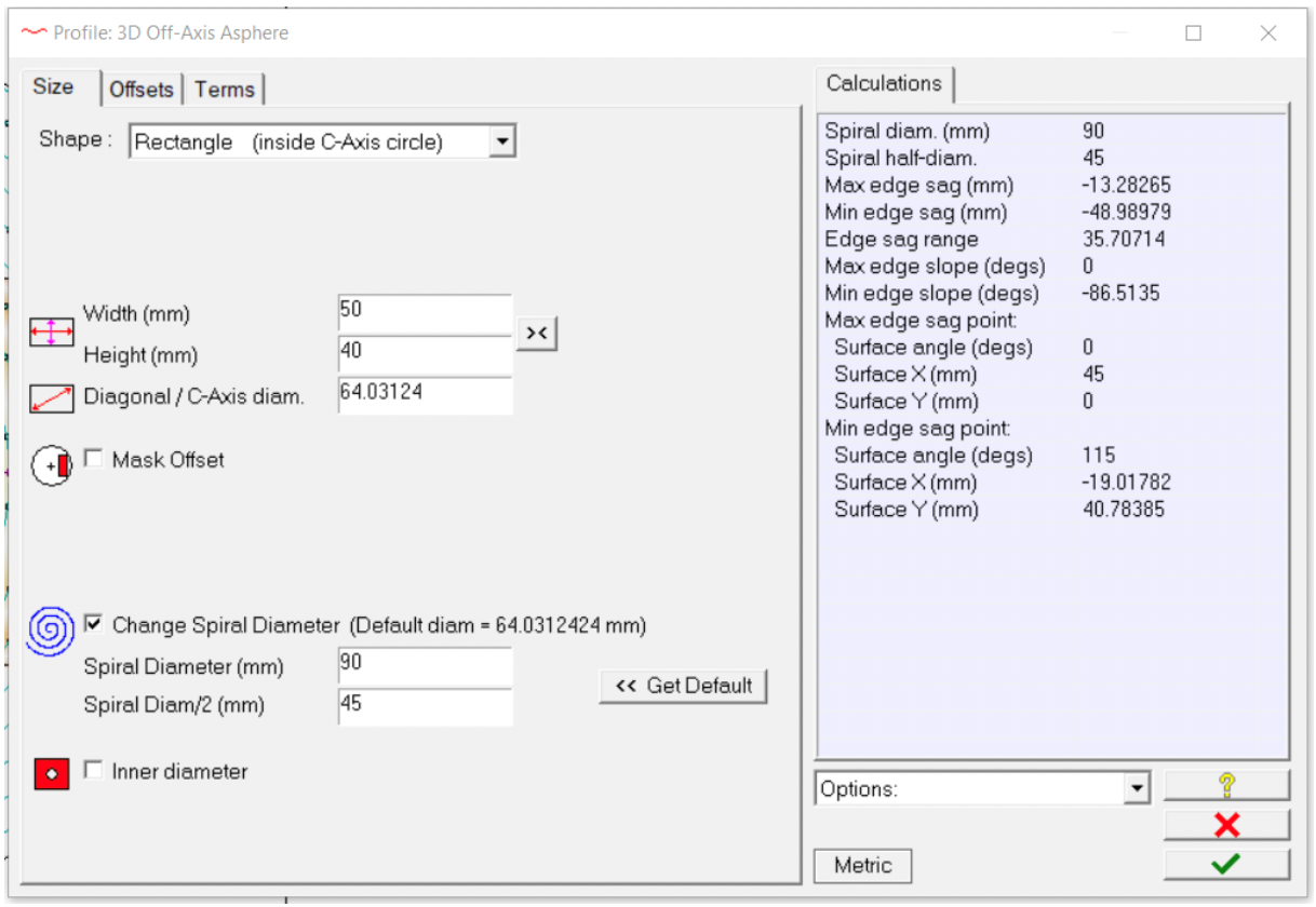 Previously, the overall C-Axis diameter was fixed, depending on the surface shape. It can now be set to any value. This has several uses, for example when a surface is tilted. Similarily, for Mask Offsets and inner diameter: Previously, when Mask Offsets were used, the inner diameter was set automatically, depending on the mask offset values. It can now be edited to any size